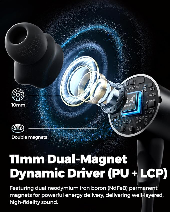 - 【Powerful Bass】Equipped with an 11 mm dual-magnet driver with a high-quality PU+LCP composite cone, it delivers powerful bass and crisp, detailed highs with precise instrument separation, giving each track a unique appeal.