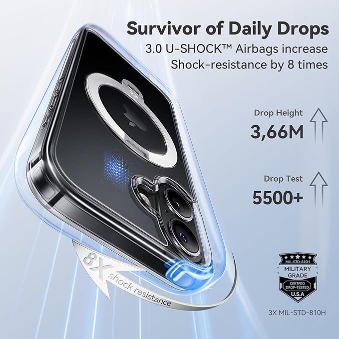 - 【17FT Military Grade Protection】Advanced TPU material with 3.0 U-SHOCK Airbags for shockproof protection, tested for drops up to 16 feet. Raised 2.5 mm camera edges and 1.5mm screen edges protect the camera. 6.00 cm² area cover effectively prevent scratching.