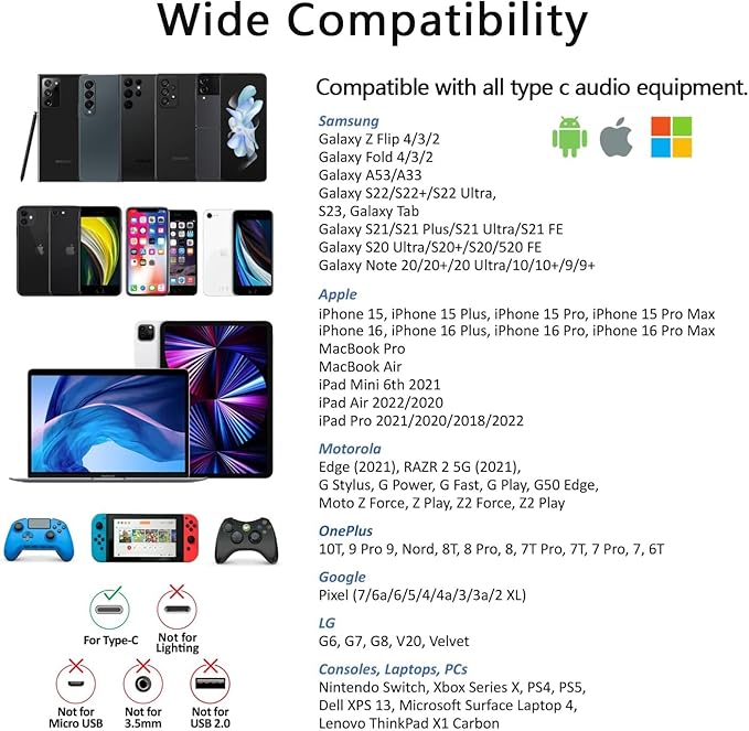 - [Compatibility List] - The USB C earphones compatible with iPhone 15 16/plus/pro/pro max, Google Pixel 8/7/6/5/4/3/3XL/2/2XL, Samsung Galaxy S25 S24 S23 S22 S21 S20 Ultra FE A53 A54, Galaxy Note 20/10 Ultra, iPad pro 2022/2021/2020/2018, One Plus, HUAWEI, LG.(If you are not sure, please feel free to consult us).