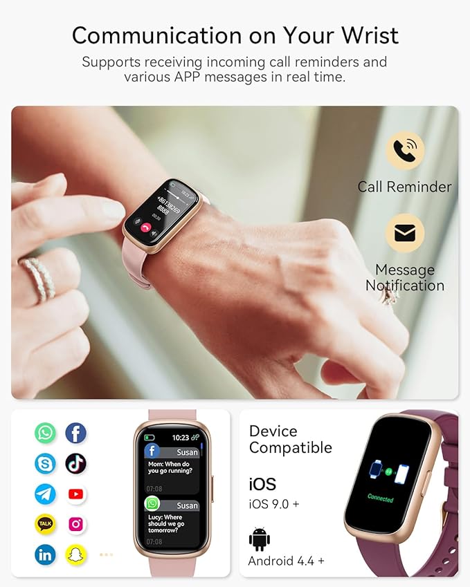 - 【Smart watch for iPhones/Android Phones】The smart watch for women/men are widely adapted with iphones and android phones. Smartwatch is able to receive text messages, notifications, and call reminders without delay, it ensures that you don't miss any important messages and reminders. Note: The watch supports viewing the full content of messages, but does not support replying to messages and making calls.