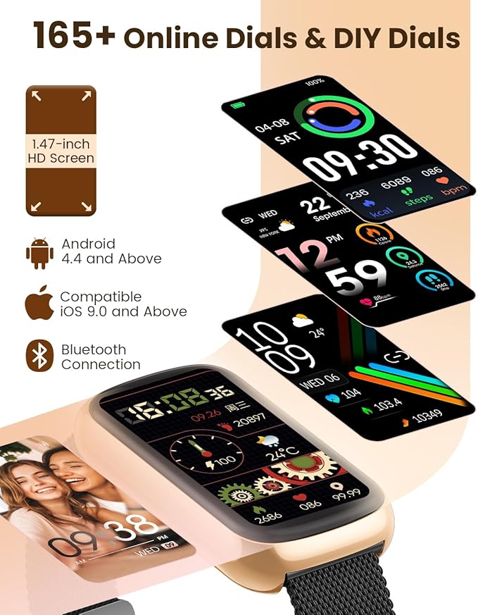 - 【1.47" UHD Screen and 200+ Watch Dial】The heart rate monitor watch uses an HD screen with increased screen resolution and screen-to-body ratio. Clear data presentation and light body weight provide you with a comfortable wearing feeling. And with more than 200 dial designs built-in APP and constantly updated, you can choose your favorite dial at will. In addition, the watch supports custom dials. You can upload your favorite photo.