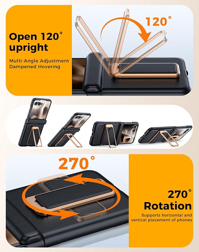 - [270° Rotatable Stand] This Moto Razr Ultra 2025 Case with stand comes with a multi-angle adjustable stand that supports 270° horizontal rotates and 120° vertical flipping, tested for over 30,000 rigorous uses without getting loose. The ergonomically designed stand provides an unmatched smooth experience and supports your phone vertically or horizontally for long periods of time, providing the perfect viewing angle. Free your hands and easily watch your favorite TV shows or Youtube videos