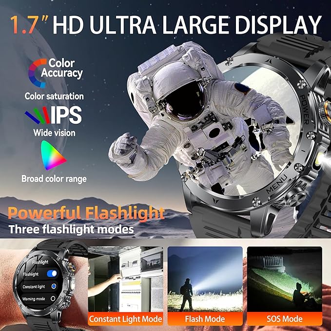 - 【1.7" HD Big Screen & Various Watch Faces】This AK87 smart watches feature a 1.7" HD screen and 60Hz adaptive refresh rate for smooth page transitions. The brightness of the men watch is adjustable, ensuring clear visibility even in direct sunlight, allowing you to easily read notifications, track fitness data, and view health data. This men's watch comes with 5 built-in watch faces, and the app offers over 100 unique online watch faces to choose from. You can also upload various photos or images to customize watch faces in different styles