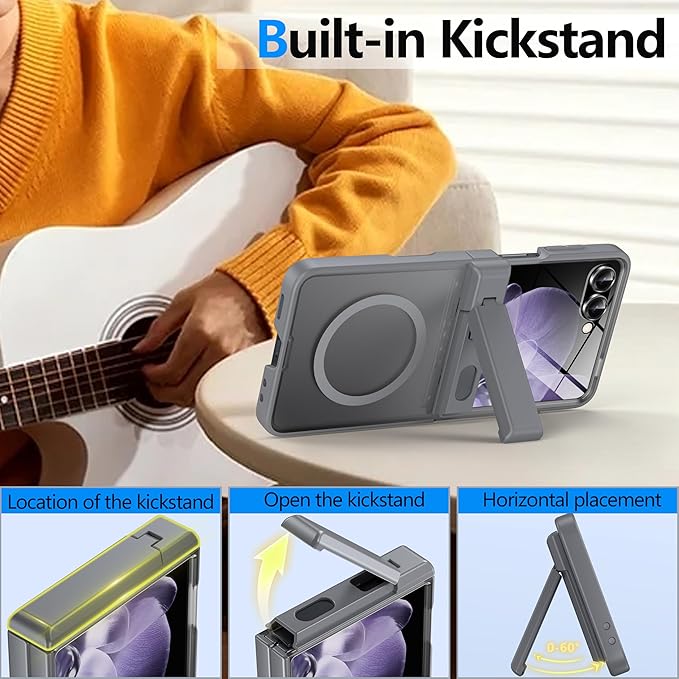 - 【Hinge Protection & Kickstand】The spring-loaded hinge protection design provides the Samsung Galaxy Z Flip 7 case with strong full-body protection against everyday wear and tear and accidental shocks.This Galaxy Z Flip 7 case comes with a built-in stand that can be placed horizontally, whether you are reading, watching a movie, browsing the web, or video chatting with friends, this case provides the best viewing experience and prevents you from back, neck and wrist pain
