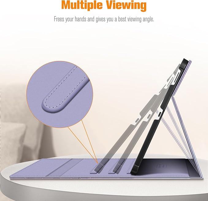 - Multiple Viewing Angles: Three anti-slip stripes allow you to adjust the tablet to multiple angles securely. Built-in magnetic strip provides sleep / wake feature