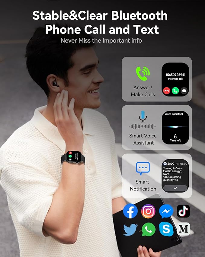 - 【Bluetooth Call & Smart Notifications】Make and receive calls with high-quality audio using the Bluetooth feature on your smartwatch. Stay informed with alerts from Facebook, WhatsApp, Instagram, Twitter, TikTok, Messenger, and more. Use voice commands with the built-in assistant for music control, weather checks, alarms, and more.(Note: This smartwatch needs to be linked to the Kstyle OS app for first use.)