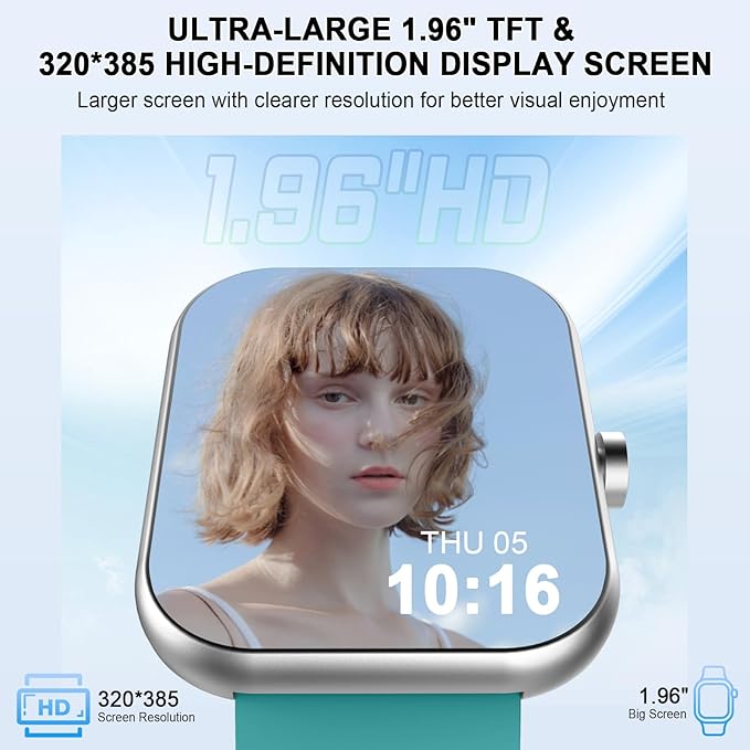 - 1.96'' HD Screen & 220+ Watch Faces: The fitness smartwatch is equipped with a large 1.96-inch HD colorful screen, delivering exceptional picture quality and highly responsive touch sensitivity. Provide you with better visual enjoyment. Customize your smartwatch with 220+ cloud-based watch faces or upload your own photos to express your unique style. Whether it's selfies or pictures of cherished moments, make your smart watch truly your own.