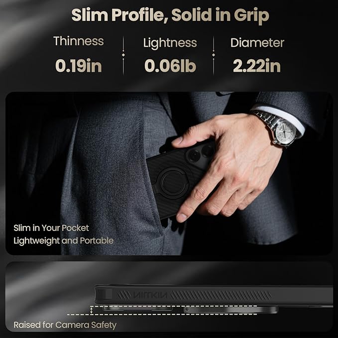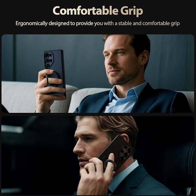 - Premium Carbon Fiber & Aviation-Aluminum Alloy: Crafted from Carbon Fiber and aviation aluminum, this phone grip holder embodies military-grade sturdiness in a sleek design. The exquisite Carbon Fiber texture exudes premium quality, while advanced aviation aluminum ensures lightweight durability. Not only does it blend classic texture with modern aesthetics, but its slim profile and refined surface also withstand daily drops, impacts, and wear