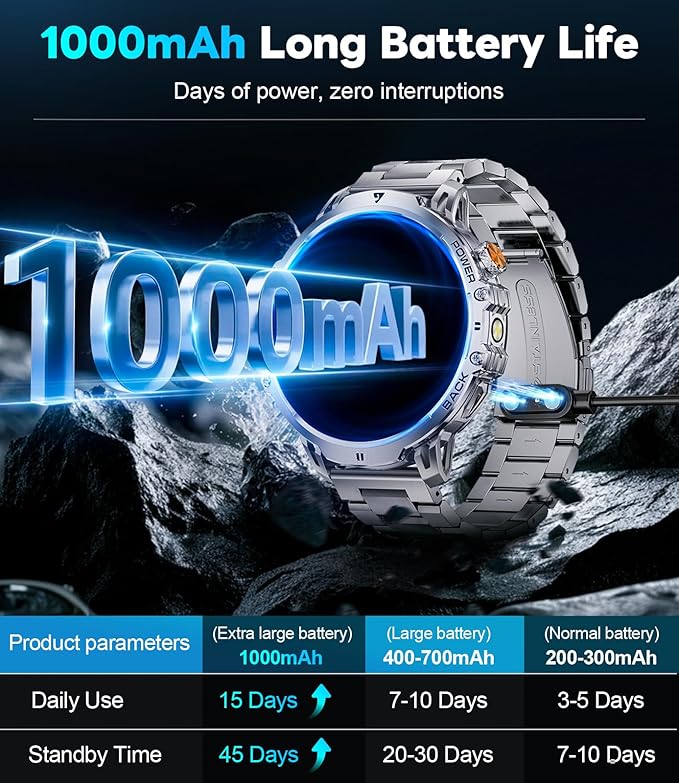 - 【1000mAh High-Endurance Battery, 50+ Days Ultra-Long Standby】 Smart watch Equipped with an efficient 1000mAh lithium-ion battery, this smartwatch ensures outstanding battery life. Under normal operating conditions, it lasts 14+ days on a single charge, with a maximum standby time of 50+ days, meeting your long-term wearing needs without frequent charging. watches for men features magnetic charging technology, taking only 2.5 hours for a full charge, providing a simple and reliable charging experience.