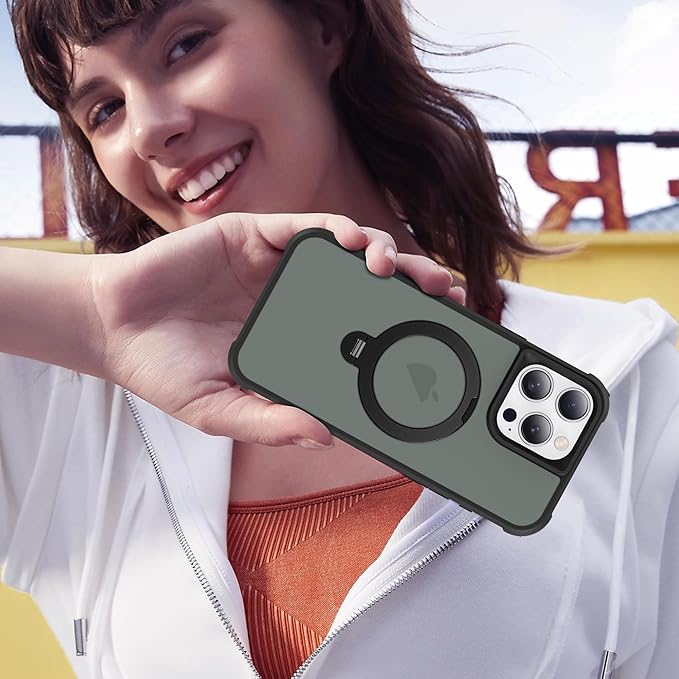 Compatible with iPhone 15 Pro Max Case with Invisible Magnetic 360°Spin Stand,Military-Grade Shockproof Protection [Compatible with Mag-Safe] Non-Slip Edge Translucent Case (6.7",Black)