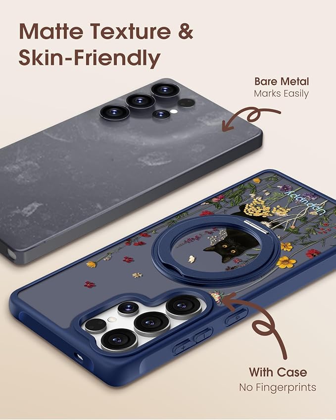 for Samsung Galaxy S25 Ultra Case with 360° Rotatable Magnetic Ring - Compatible with MagSafe, Semi-Transparent Soft-Touch Material Shockproof, Cute Black Cat Design for Women Girl