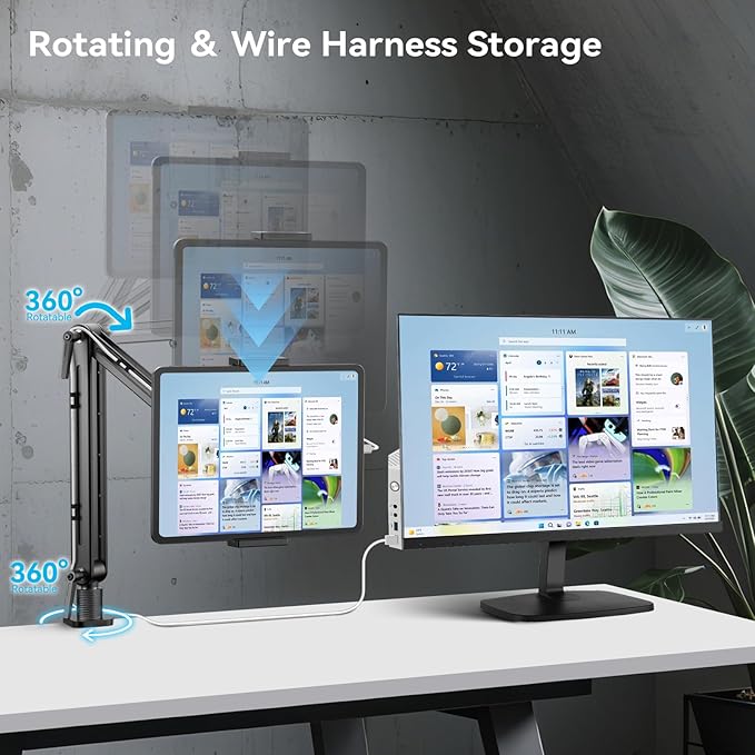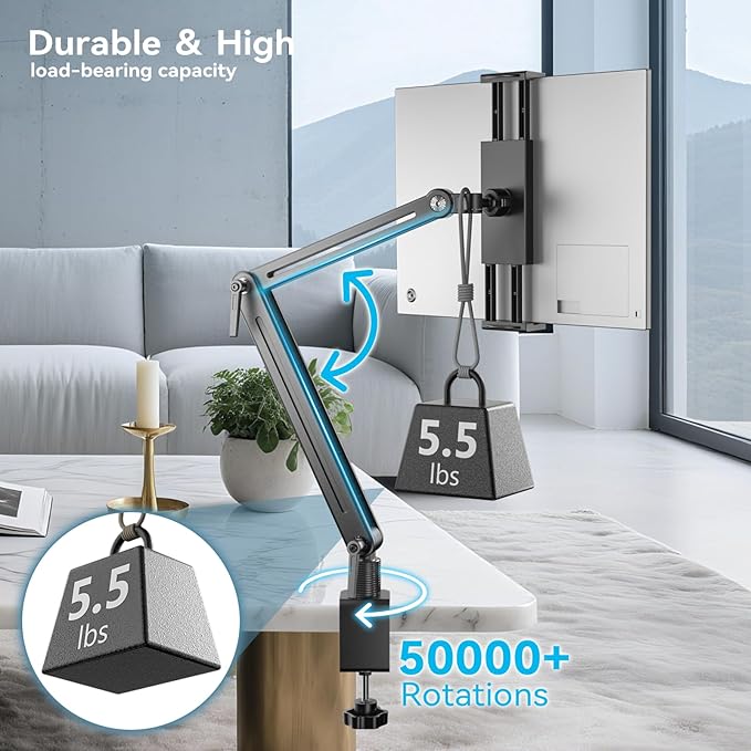 - Wide compatibility: This portable tablet stand works with devices ranging from 4.7 to 15.6 inches, including portable monitors, tablets, iPad and phones. Tablet arm is perfect for the office, bedroom, living room, or dining room.