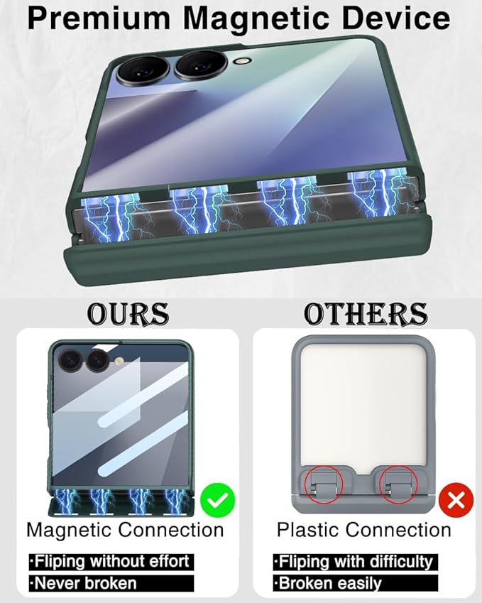 - [Advanced Hinge Protection]: Our Z Flip 7 case features an innovative hinge protection design specifically for the Galaxy Flip 7, providing complete protection from all angles. Our Z Flip 7 case is designed with a unique magnetic connection that won't be broken by impacts such as drops. Besides, our z Flip 7 case with unique design flips more smoothly without spring resistance.