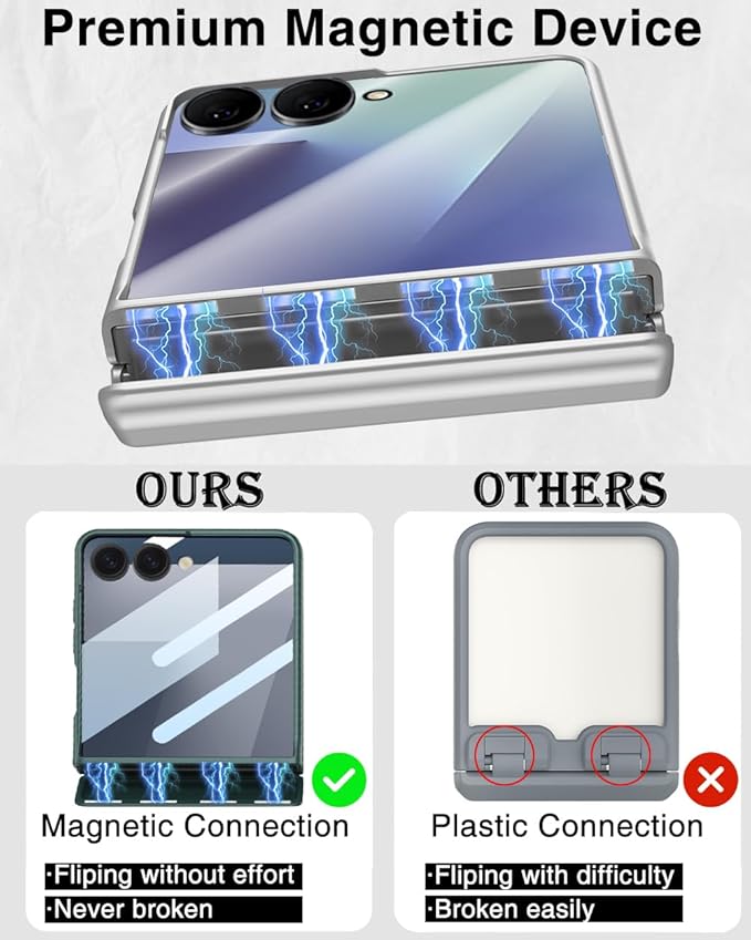 - [Advanced Hinge Protection]: Our Z Flip 7 case features an innovative hinge protection design specifically for the Galaxy Flip 7, providing complete protection from all angles. Our Z Flip 7 case is designed with a unique magnetic connection that won't be broken by impacts such as drops. Besides, our z Flip 7 case with unique design flips more smoothly without spring resistance.