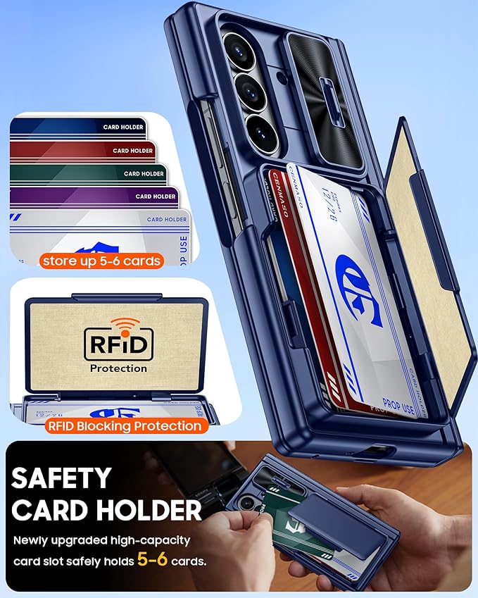 - 【Storage 5 Cards + Cash】The Z Fold 7 Case built-in hidden card holder. Storage design allows you to carry essential cards and cash securely. you can safely store 5 cards or a small amount of cash.So you can say goodbye to bulky wallets. This z fold 7 case with card holder for men and women uses advanced RFID blocking technology to effectively block RFID signals and prevent theft when traveling, shopping, or exploring, protecting your identity,keep everything safe