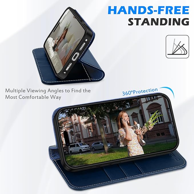 SHIELDON Real Leather Wallet Case for iPhone 17 6.3-inch 2025 | Magnetic Closure | RFID Blocking Card Slot | Kickstand | Shock-Absorbent | Soft Interior Phone Cover | Retro Dark Blue