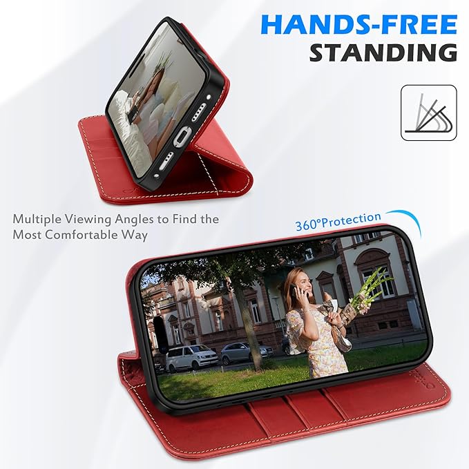 SHIELDON Case Wallet for iPhone 17 5G 6.3" 2025 | Genuine Leather | RFID Blocking Card Holder | Folio Magnetic Closure | Kickstand | Shockproof | Full Protective Cover | Retro Red