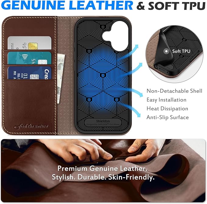 - 【GENUINE LEATHER & FULL PROTECTION】 SHIELDON leather cases for iPhone 17 are made from oil wax cowhide leather + TPU phone holder case. 1. Oil wax leather is often polished and oiled, which makes the surface anti-scratch, shinier and sleeker. The more you use, the more retrospective it will be; 2. Soft full-body shell comes with shockproof edge and ensures your phone against scratches, drops and bumps; 3. The increased lips around the lens will protect your camera