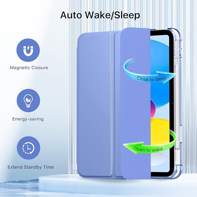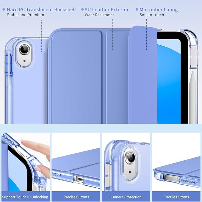 - Auto Sleep/Wake Function: The slim iPad case 10th generation supports auto sleep and wake feature, open or close the case, wake up the tablet or put it into sleep, save battery power and extend the use time. Precise cutouts support Touch ID functionality, and easy access to buttons, ports, speakers and more
