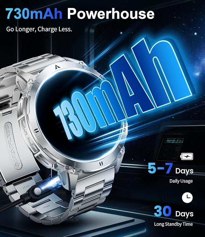 - [Say Goodbye to Battery Anxiety] Experience unmatched convenience with the powerful 730mAh battery in this smart watch for men that fully charges in just 2 hours - giving you more time connected and less time waiting as this smart watches for men delivers exceptional power efficiency perfect for your on-the-go lifestyle, making this rapid-charging mens smartwatch the ideal choice for active men who need their technology to keep pace with their demanding schedule without slowing them down.