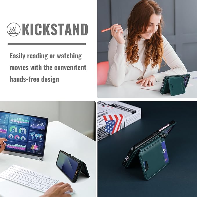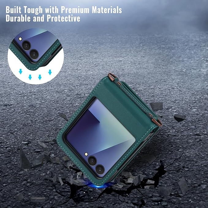 ASAPDOS for Samsung Galaxy Z Flip 7 PU Leather Wallet Phone Case with Card Slots (Holds 5 Cards), Anti-Drop Protection, Wrist & Shoulder Strap Blue Green