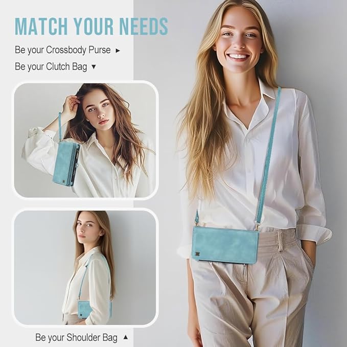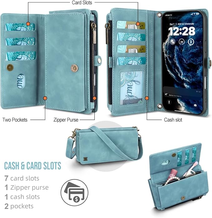 - 【Card Slots & Zipper & Wristlet】: This iPhone 17 Pro wallet case includes 8 card holder + 1 zipper bag + 1 cash slots+2 large pocket+1 shoulder strap +1 wrist strap ,hold your ID,credit cards,driver license,bills,lipstick, headphones, mini makeup case, blush case,coins and a little bit cash without problems Various items for daily life, such as.