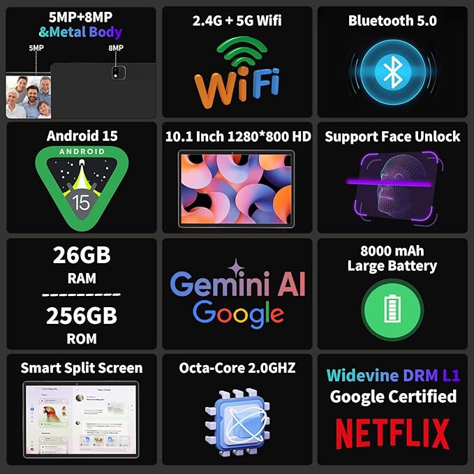 - 【26GB RAM+256GB ROM+2TB Expansion】 Android 15 tablet comes with 26GB RAM (6GB fixed memory, 20GB virtual memory) 256GB ROM capacity and 2TB Micro SD card expansion (Micro SD card not included), large storage meets your daily entertainment and work what you need, for example, store photos, videos, songs, e-books and important files