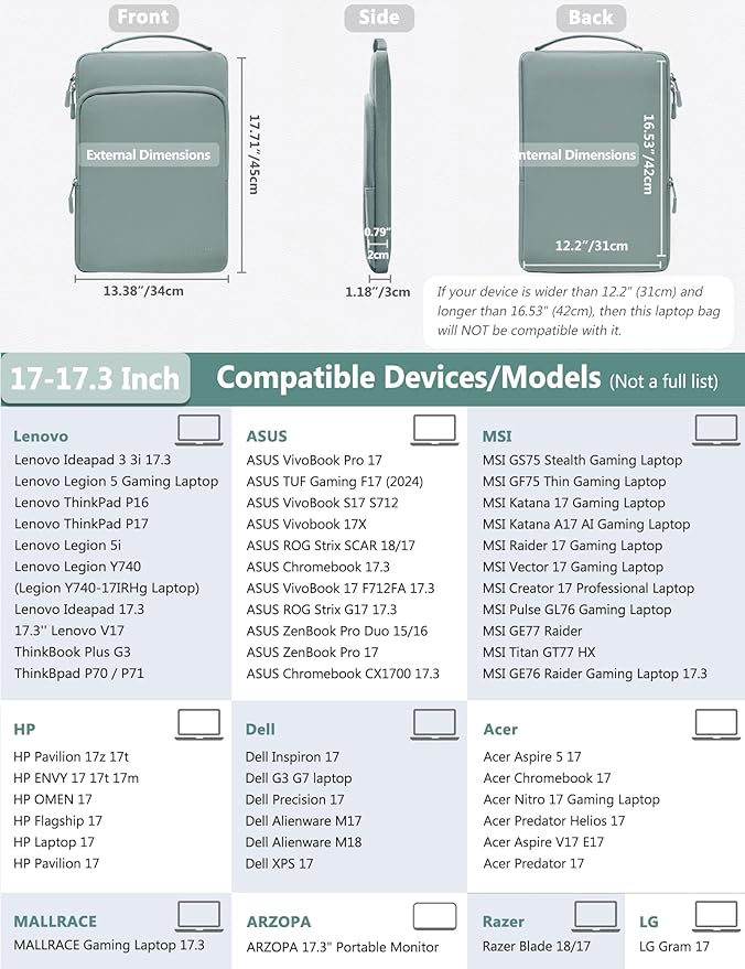 - Internal Dimensions: 16.53" x 11.81" x 0.79". Compatible with HP Laptop 17, HP Pavilion/ENVY/OMEN/Flagship 17, Dell Inspiron/Precision/XPS 17, ASUS VivoBook (Pro) 17, ASUS ChromeBook 17.3, ASUS ZenBook Pro 17, ASUS ROG Strix Scar 17, ASUS TUF Gaming F17, Lenovo Ideapad 3 3i 17.3, Lenovo ThinkPad P17, Lenovo Legion 17.3, Acer Chromebook/Nitro/Aspire 5 17, Acer Predator (Helios) 17, Razer Blade 17/18, MSI Gaming Laptop 17, MALLRACE Gaming Laptop 17.3, LG Gram 17, etc.