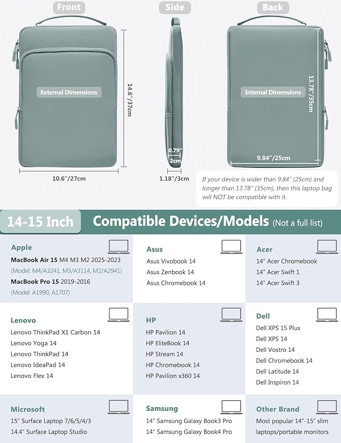 - Internal Dimensions: 13.78" x 9.84" x 0.79". Compatible with MacBook Air 15 M4 M3 M2 2025-2023 (A3241/A3114/A2941), MacBook Pro 15 2019-2016 (A1990/A1707), 14" HP Pavilion/EliteBook/Stream/Chromebook/Pavilion X360, 14" Dell Vostro/Chromebook/Latitude/Inspiron, Dell XPS 14/15 Plus, 15" Surface Laptop, 14.4" Surface Laptop Studio, ThinkPad X1 Carbon/Yoga 14, ThinkPad/IdeaPad/Flex/Yoga 14, Asus Vivobook/Zenbook/Chromebook 14, 14" Samsung Galaxy Book3/Book4 Pro, etc.