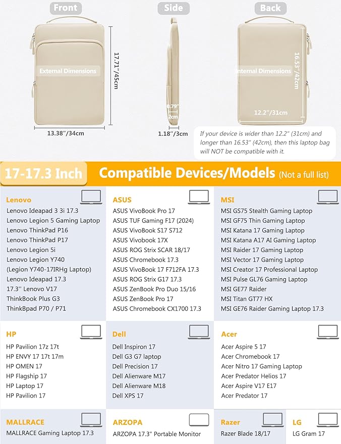 - Internal Dimensions: 16.53" x 11.81" x 0.79". Compatible with HP Laptop 17, HP Pavilion/ENVY/OMEN/Flagship 17, Dell Inspiron/Precision/XPS 17, ASUS VivoBook (Pro) 17, ASUS ChromeBook 17.3, ASUS ZenBook Pro 17, ASUS ROG Strix Scar 17, ASUS TUF Gaming F17, Lenovo Ideapad 3 3i 17.3, Lenovo ThinkPad P17, Lenovo Legion 17.3, Razer Blade 17/18, MSI Gaming Laptop 17, MALLRACE Gaming Laptop 17.3, LG Gram 17, etc.