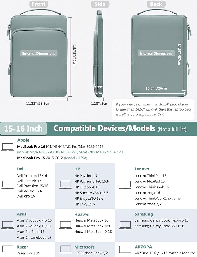 - Internal Dimensions: 14.57" x 10.24" x 0.79". Compatible with MacBook Pro 16 M4/M3/M2/M1 Pro/Max 2025-2019 (A3186, A3403, A2991 A2780 A2485 A2141), MacBook Pro 15 2015-2012 (A1398), 15" Surface Book, Dell Inspiron/Latitude/Precision/Vostro 15, HP Pavilion/Elitebook/Envy 15, HP Pavilion/Spectre/Envy X360 15.6, Samsung Galaxy Book Flex/Pro 15, Lenovo IdeaPad/ThinkPad 15, Yoga/ThinkBook 16, Asus ZenBook/VivoBook Pro 15, VivoBook 15/16, Razer Blade 15, ARZOPA 15.6"/16.1" Portable Monitor, etc.