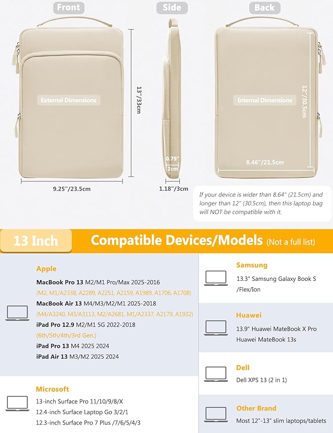 - Internal Dimensions: 12" x 8.46" x 0.79". Compatible with MacBook Air 13 M4/M3/M2/M1 2025-2018 (A3240, A3113, A2681, A2337, A2179, A1932), MacBook Pro 13 M2/M1 Pro/Max 2025-2016 (A2338, A2289, A2251, A2159, A1989, A1706, A1708), 2025 2024 iPad Pro 13 M4 & iPad Air 13 M3 M2, iPad Pro 12.9 2022-2018, 13"-12.3" Surface Pro, 12.4" Surface Laptop Go, Dell XPS 13, 13.9" Huawei MateBook X Pro, Huawei MateBook 13s, 13.3" Samsung Galaxy Book S/Flex/Ion, and most 12"-13" slim laptops/tablets, etc.