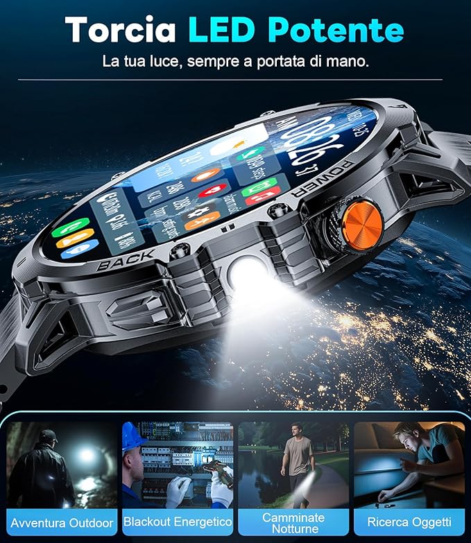 - 💪【1000mAh Battery & Built-in LED Flashlight】This men's smartwatch is equipped with a powerful 1000mAh battery, offering up to 65 days of standby time. Stay focused on your outdoor adventures without the hassle of frequent charging. Whether you're hiking, training, or exploring, the battery delivers reliable performance when you need it most. The built-in LED flashlight enhances visibility and safety, letting you check the time or your path even in darkness—perfect for nighttime activities or harsh weather. An ideal choice for men who value durability and functionality.