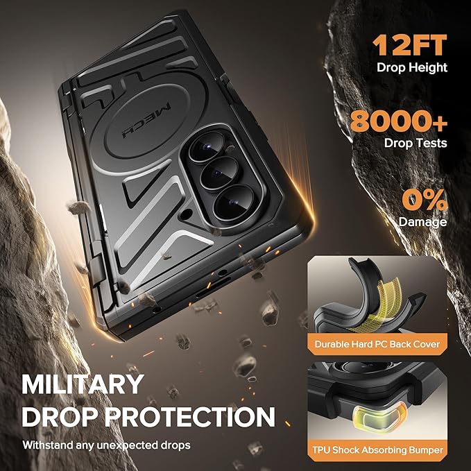 - [Upgraded Elastic Soft TPU & Robust Durable PC for Military Drop Protection] This Z Fold7 case consists of a high strength tough PC back cover and a upgraded elasticity, wear-resistant TPU shock absorbing bumper frame, with a dual-layer shockproof and rugged construction. The case provides reliable protection for your phone against severe drops, impacts, and collisions. Our cases exceed the military shock specification standard and have been drop tested at 12 feet and 16 feet
