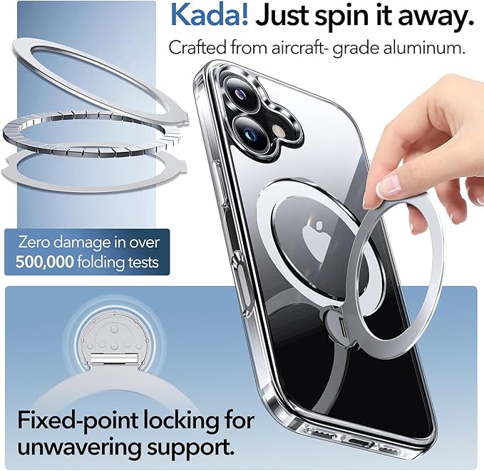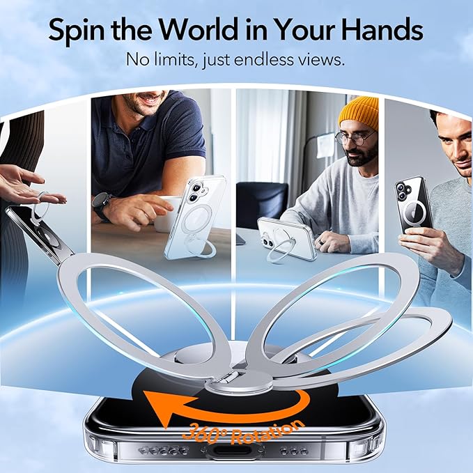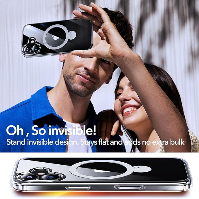 - [360° ALL-in-ONE Rotating Stand, Ring Holder, and Magneitc Charging] It’s everything you need, without the excess. This clear magnetic iPhone 17 phone case with stand ring effortlessly blends style and function. The 360° magnetic rotatable ring holder stays hidden when not in use — keeping the silhouette clean and minimal. When opened, it folds into a stable triangle stand, ready for hands-free moments on any surface. The ring holder fits naturally in your hand, offering a comfortable grip or an extra hook when life gets busy