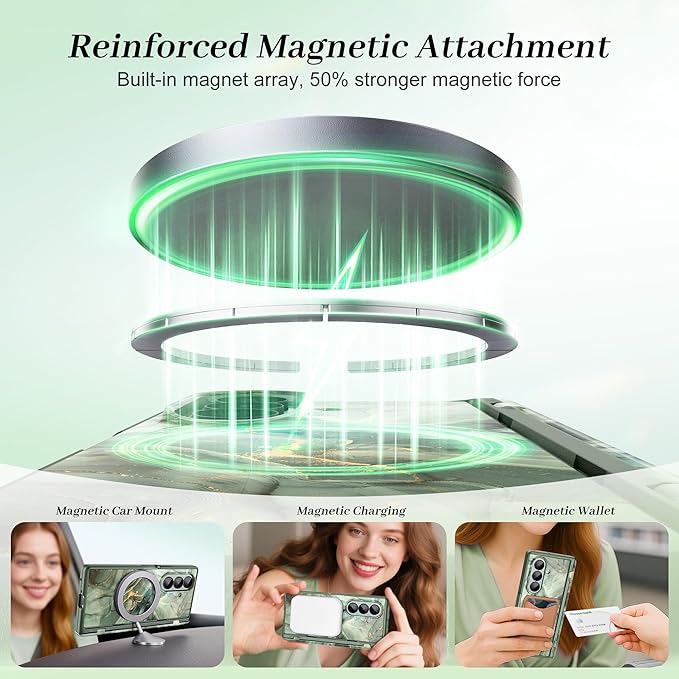 - Upgrade Magnetic Strength: Featuring an integrated ultra-powerful magnetic ring (15X stronger than standard cases), this Z Fold 7 case delivers industrial-grade attachment security for all MagSafe-compatible accessories; Enjoy a steadfast connection with magnetic wallets, car mounts, wireless chargers, zero-slip guaranteed during daily use or travel. Maintains full compatibility with Qi wireless charging. Note: Due to hinge design, some accessories may not charge when your phone is fully opened