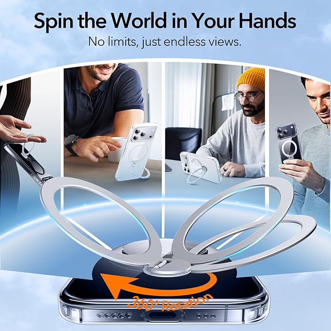 - [360° ALL-in-ONE Rotating Stand, Ring Holder, and Magneitc Charging] It’s everything you need, without the excess. This clear magnetic iPhone 17 pro phone case with stand ring effortlessly blends style and function. The 360° magnetic rotatable ring holder stays hidden when not in use — keeping the silhouette clean and minimal. When opened, it folds into a stable triangle stand, ready for hands-free moments on any surface. The ring holder fits naturally in your hand, offering a comfortable grip or an extra hook when life gets busy