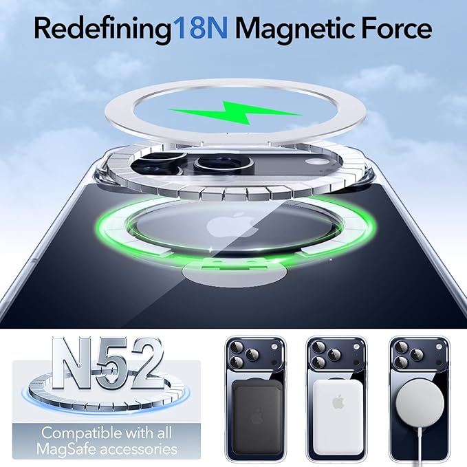 - [Secure & Strong Magnetic Loop] Fully Mag-safe compatible, this slim transparent iPhone 17 pro kickstand case features a powerful built-in magnet with Halbach-Mag technology and N52SH magnets, providing a secure connection with accessories like leather wallets, wireless chargers, and car mounts. The iPhone 17 pro shockproof crystal clear case offers 40% stronger magnetic force (18N) than standard cases, ensuring a stable, wobble-free attachment. Designed for iPhone 17 pro, this case aligns perfectly with your device, ensuring a stable, wobble-free attachment experience