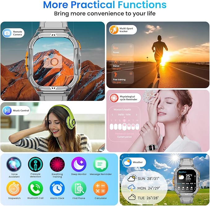 - 【100+ Sports Modes & Versatile Smart Features】 Rogbid X5 GPS bluetooth smartwatch doubles as a pro fitness tracker with 100+ sports modes—from gym workouts to swimming, hiking, and skiing—accurately recording exercise data (paired with "GloryFitPro app" for stable performance and precise stats). It also offers SOS function, Compass, Altitude Measurement, Weather, Alarm clock, Raise wrist-Wake, Music control, Remote-control Photography, Stopwatch, Timer, Find phone, Find watch, Not disturb mode, Stress relief, Period tracking, Calculator, and 100+ dial styles (plus photo DIY), keeping life organized, efficient, and fun