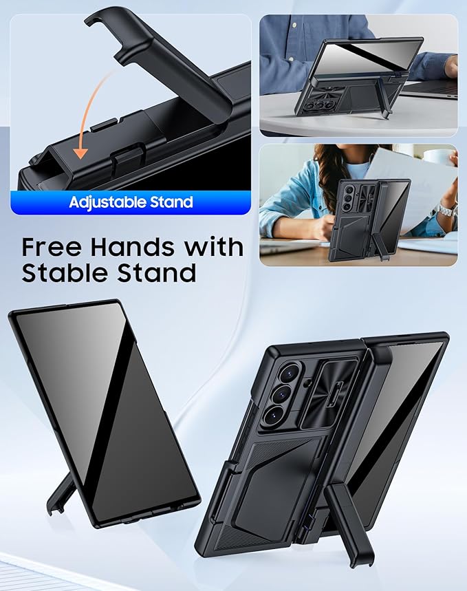 - Efficient Hidden Phone Kickstand: This designed for Samsung Z Fold 7 phone case has a hidden phone stand under the hinged protective cover. When you need to use your phone to watch movies or work, you only need to pull up the buckle under the hinge protective cover to get a Z Fold 7 case with a stable stand, instantly freeing your hands. When the stand is not in use, you only need to pull it down and press the buckle to hide the stand perfectly.
