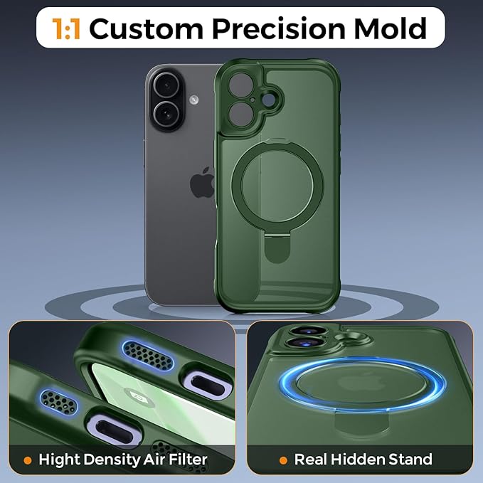 MOCCA Compatible with iPhone 17 Case with Magnetic Invisible Stand [Full Camera Protection] [Compatible with Magsafe] Military Drop Shockproof Translucent Matte Phone Case Cover 6.1",Dark Green