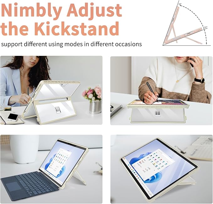- 【Comfortable Experience】Featuring a channel for seamless connection to the Microsoft Surface Pro 11, Pro 10, Pro 9, Pro 8 type cover keyboard, this case allows users to easily use their device without having to remove the case. Adjusting to different angles is made easy with the built-in kickstand, allowing you to find the perfect viewing position without having to remove the case. The durable hard shell also safeguards the built-in kickstand from scratches, bumps, and stains.