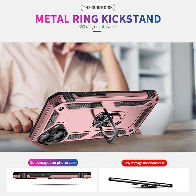 ADDIT Compatible with iPhone 17 Case with Tempered Glass Screen Protector, Adjustable Kickstand Ring, Military-Grade Heavy Duty Protection, Shockproof, Anti-Fingerprint,Rose Gold