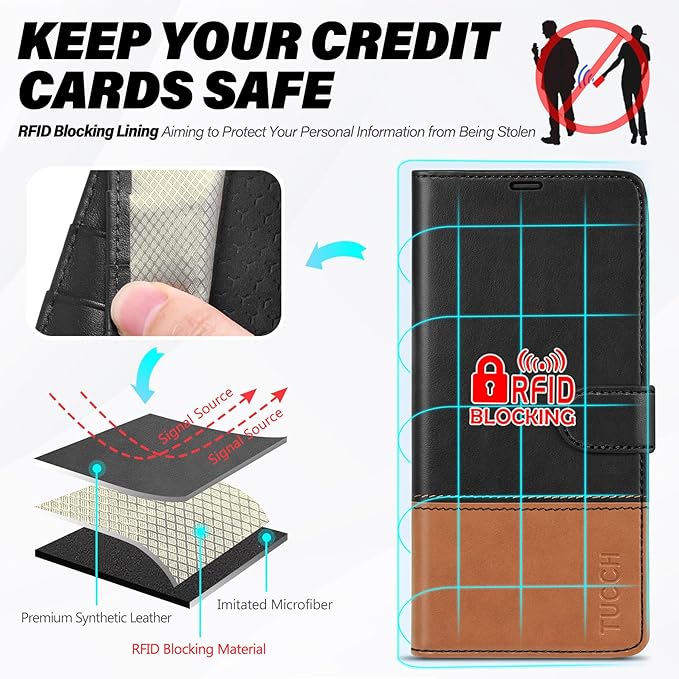 TUCCH Wallet Case for Galaxy S25 FE 5G, Magnetic PU Leather Stand [RFID Blocking] 4 Card Slots Folio Protective Cover with TPU Shockproof Inner Shell (6.7") 2025, Black & Brown