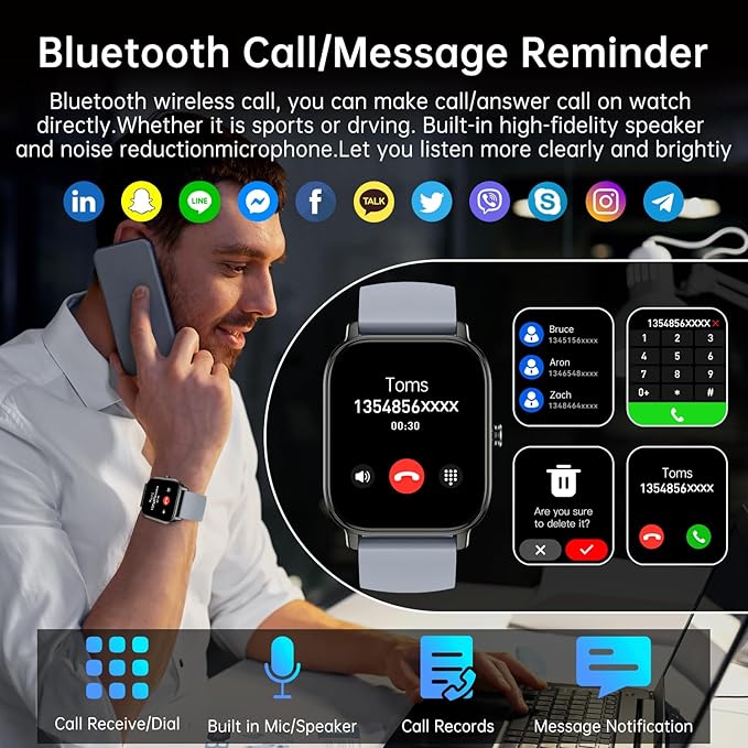 - Smart watch with text and call: ios android smart watches for men women is equipped with a clear speaker,running watches can directly use womens mens watch to answer make calls/read messages/store contacts/play music.You can get notifications of calls, SMS and SNS messages, text, Whatsapp, facebook etc.ios android watch for men women can support most android and iOS phone(andriod 5.0 and above iOS 9.0 and above).Such as compatible with iPhone, Samsung, HUAWEI,etc