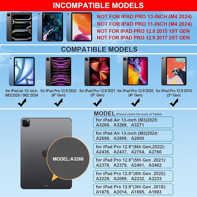- Case Compatibility: Elevate your 2024 / 2025 iPad Air 13 inch or iPad Pro 12.9 experience with our versatile keyboard case. Compatible with iPad Air 13 inch M3 2025 (Model Number: A3268 A3269 A3271) and for iPad Air 13 inch M2 2024 (Model Number: A2900 A2899 A2898) and for iPad Pro 12.9 inch 6th Generation (Model Number: A2436 A2437 A2764 A2766) and for iPad Pro 12.9 inch 5th Generation (Model Number: A2378 A2379 A2461 A2462) and for iPad Pro 12.9 inch 4th 3rd Generation (Model Number: A1876 A1983 A1895 A2014 A2229 A2069 A2232 A2233); We’re happy to help! Reach out to us if you need to check compatibility.